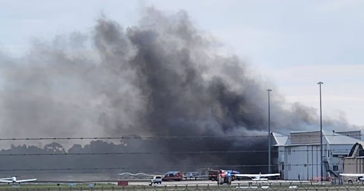 {img}The four-seat twin-engined Diamond DA42 plane had just taken off from Parafield Airport, north of Adelaide, shortly after 2 pm, when it crashed into a hangar where a major amount of fuel was stored.