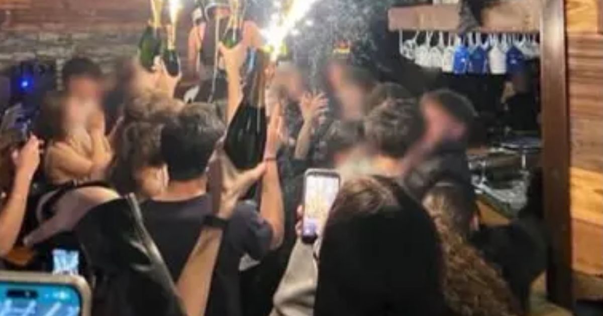 {img}The incident arose at the Crans-Montana ski resort in the heart of the Swiss Alps. Another picture showed a woman in a crash helmet holding up lit bottles while being carried back on the shoulders of a masked man.