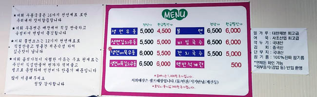 이곳의 주메뉴는 생면 우동과 쫄면이다. 그리고 우동에 김치를 얹으면 생면김치우동(5,000원), 우동은 얹으면 생면어묵우동(5,500원), 김치와 우동을 다 얹으면 생면어묵김치우동(6,000원)이 된다. 그리고 사이드 메뉴로 잔치국수(5,000원)와 비빔국수(6,000원), 그리고 맥반석 달걀(500원)이 있다. 모든 메뉴의 곱배기는 1,000원 추가다.