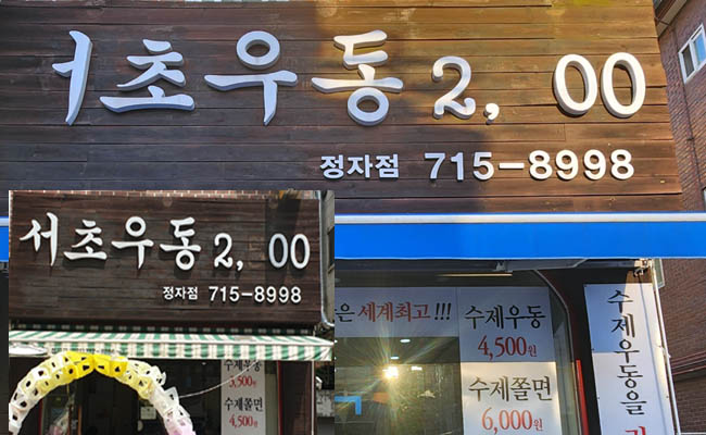 그래서 그런지, 분당에서 그런 곳이 있다는 사실만으로 행복함을 느낀다. 정자동 한솔마을 건너편에 위치한 이곳은 간판부터가 범상치 않다. 'ㅓ초우동 2, 00'이라고 붙어있다. 이곳을 한번쯤 와본 사람은 금방 해석이 가능하다. 즉, 원래 간판은 '서초우동 2,500'이었다. 그러니까 우동 가격이 2,500원이라는 뜻을 강조하기 위해 만든 간판이었던 셈이다.
