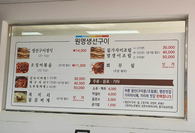 이것은 '원영생선구이'를 전혀 모르고 온 손님들이 하는 말이다. 오히려, 이런 손님이 더 반갑다. 40년 내공을 숨기고 오로지 맛을 가지고 평가 받을 수 있는 기회이기 때문이다. "여기, 뭐가 맛있어요?"라고 묻는다면 살포시 생선구이와 오징어볶음 등을 권한다.