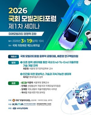 더불어민주당 윤후덕 의원(파주 갑, 외교통일위원회)이 공동대표의원으로 있는 국회의원 연구단체 ‘국회 모빌리티포럼’이 3월 19일(목) 오전 10시, 국회의원회관 제2소회의실에서 ”미래모빌리티 경쟁력 강화”를 주제로 “2026년 국회모빌리티포럼 제1차 세미나”를 개최한다.