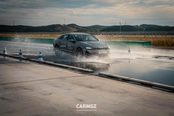 젖은 노면 서킷은 아이오닉5와 EV6로, 수막현상과 긴급 제동은 아반떼 N라인 및 K5로 진행됐다. 일반적인 도로의 절반 수준에 달하는 마찰계수가 적용된 특수 도로다. 제때 멈추지 못하고 하염 없이 미끄러지는 차의 거동은 ‘빗길에서 절대 감속해야 하는 이유’를 다시 깨우쳐준다.