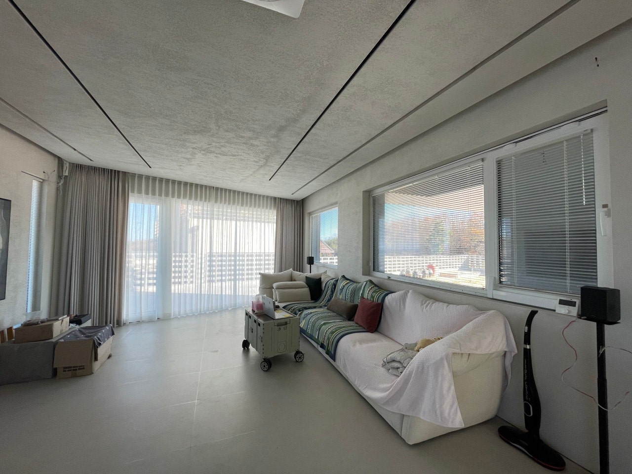 🏠 거실 정면 대형 창문: 천장 매립 레일 + 암막커튼 + 쉬폰 레이어드
