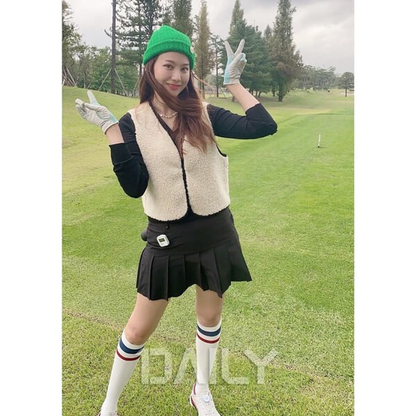 유인영은 상큼 발랄한 골프 룩을 뽐냈다. 잇 템으로 떠오른 베스트(vest)와 비니를 활용한 모습이다. 그는 실패 확률이 적은 블랙 컬러의 티셔츠와 테니스 스커트를 매치한 뒤 포근한 텍스처가 돋보이는 플리스 재질의 베스트(vest)로 귀여움을 더했다. 여기에 스트라이프 패턴이 돋보이는 니삭스와 초록색 비니로 캐주얼한 분위기를 가미시켰다. 골프 패션을 어떻게 입어야 할지 고민이라면 유인영처럼 올블랙 패션에 비비드한 액세서리로 포인트를 더해보자.