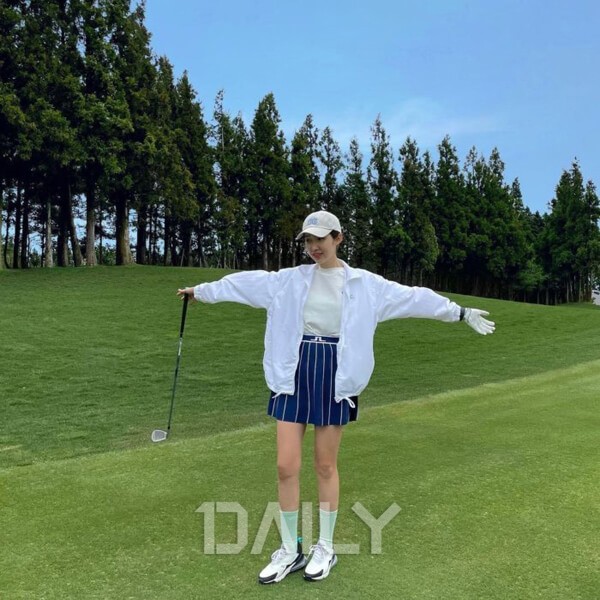 어떤 옷이든 스타일리시하게 소화하는 패셔니스타 차정원이 골프 패션을 선보였다. 기능성을 강조한 기존의 골프 웨어가 아닌 힙한 스타일로 여성들의 이목을 끌었다. 차정원이 필드 위에서 즐겨 입는 잇 아이템은 ‘윈드브레이커’다. 윈드브레이커는 간절기 날씨에 체온을 조절해주는 것은 물론, 가볍게 걸칠 수 있어 부담 없이 시도해볼 수 있는 아이템이다. 차정원은 스트라이프 패턴의 니트 스커트에 민트 삭스로 포인트를 줘 꾸안꾸 골프 룩을 선보였다.