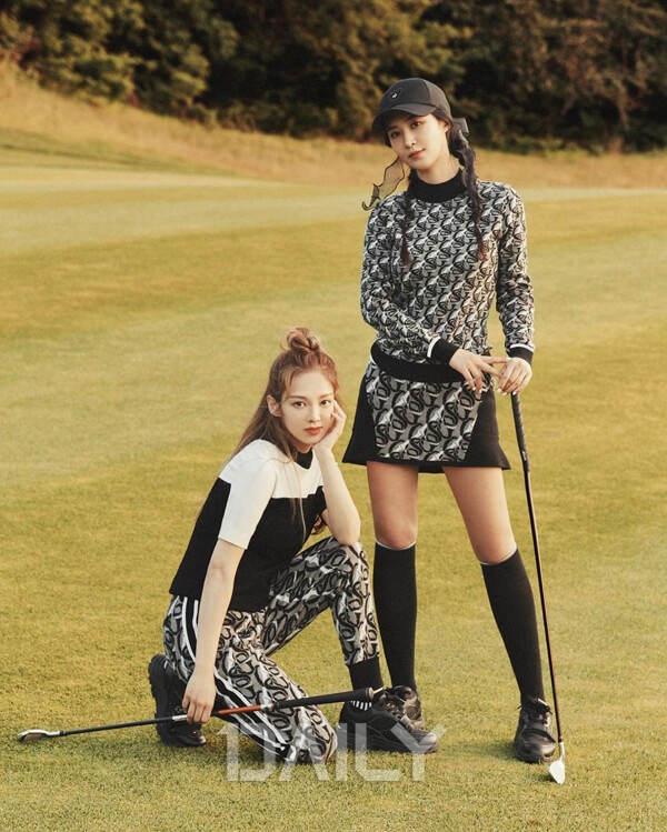 혼자 즐겨도 재밌는 골프, 친구와 함께하면 두 배로 즐거울 것이다. 필드에 같이 나간 친구와 골프 시밀러 룩에 도전해보자. 자칫 촌스러워 보일 수 있는 골프 시밀러 룩을 세련되게 즐기는 방법은 패턴이나 컬러를 통일하는 것이다. 어느새 데뷔 14년 차를 맞이한 레전드 걸그룹 소녀시대의 멤버 효연과 유리는 패턴이 돋보이는 골프 룩으로 유니크한 무드를 뽐냈다. 효연은 로고가 돋보이는 팬츠를 착용했고, 유리는 로고 투피스 셋업으로 쉽고 간편한 시밀러 룩을 완성했다.
