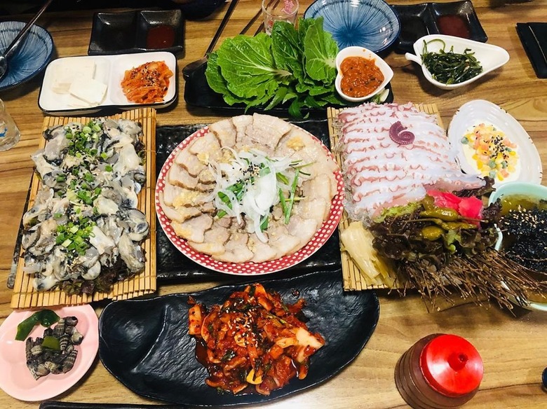 지역 내에서는 이미 유명한 곳, 가게 이름부터 이곳의 대표 메뉴가 문어 삼합이라는 것을 알 수 있다. 매일매일 동해에서 받는 싱싱한 문어는 소금과 밀가루로만 깨끗하게 세척하고 매실청과 대파, 무 등을 넣어 삶아 냉장 숙성의 시간을 거친다. 그러면 특유의 탱탱하고 부드러운 식감이 더욱 배가된다. 수육을 삶을 때도 정성이 깃드는데 엄나무와 건당귀와 같은 각종 한약재와 맥주를 넣어 잡내는 싹 잡은 촉촉한 수육이 완성된다. 여기에 김치와 장아찌 등을 함께 싸서 먹으면 제대로 된 문어 삼합을 즐길 수 있다.