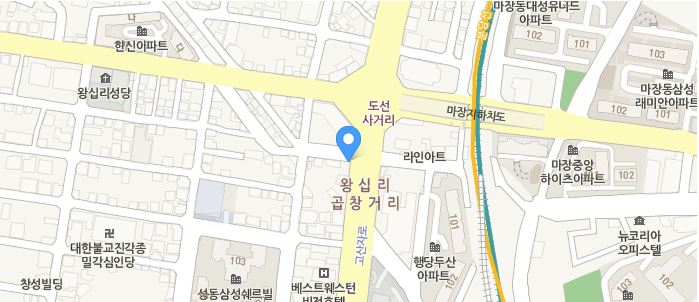 주소: 서울 성동구 고산자로 289전화번호: 02-2295-1233영업시간: 매일 15:00-02:00메뉴: 소곱창(22,000원)ㅣ연탄불곱창(13,000원)ㅣ소야채곱창(22,000원)