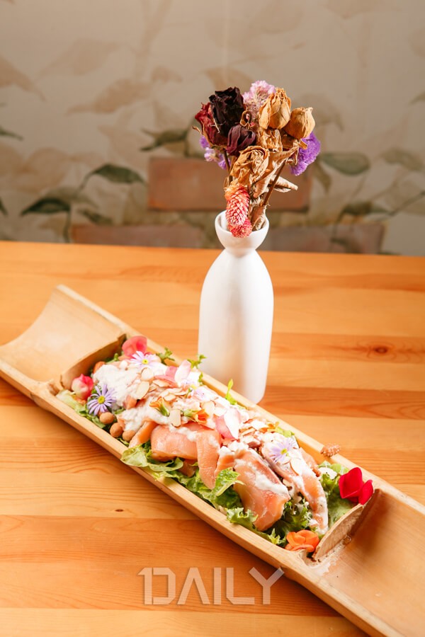 가게 이름만 보면 왠지 꽃집 같지만 예상외로 술집이다. 재료를 직접 손질하고 끼워 만든 수제 꼬치 메뉴와 꽃과 함께 먹는 샐러드가 이곳의 인기 메뉴다. 꼬치가 모둠으로 제공되는 세트 이름은 꽃다발로 센스 있는 작명 센스까지 갖췄다. 꼬치 메뉴로 자칫 느끼해질 수 있는 입안을 빠르게 상쾌함으로 채워주는 샐러드에는 싱싱함이 뚝뚝 떨어지는 갖은 채소와 더불어 형형색색의 컬러풀 한 앙증맞은 꽃들이 곁들어져 있다.