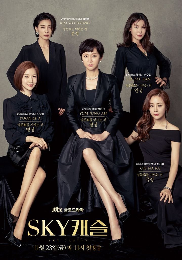 스카이캐슬은 JTBC에서 20부작으로 만든 드라마이다. 상위 0.1%가 모여 산다는 캐슬 안에서 명문가 출신의 사모님들이 자식을 최고로 키우려는 욕망과 풍자가 내용으로 담겨있다. 극 중 ‘전적으로 믿으셔야 됩니다.’ ‘감수하실 수 있습니까’ 등 입시 코디네이터의 명대사로 유명하다. 최고 시청률 23.8%로 회를 거듭하면서 장안의 화제 속에 막을 내렸다.