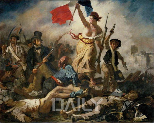 '민중을 이끄는 자유의 여신'은 1830년 프랑스의 7월 혁명을 묘사했다. 인물들이 삼각구도를 띠고 있는 이 작품의 가장 큰 포인트는 바로 자유의 여신이 들고 있는 삼색기이다. 자유, 평등, 박애를 상징하는 삼색기는 프랑스의 국기인 만큼 굉장히 상징적인 작품이라고 할 수 있다. 또한 재미있는 점은 중절모를 쓰고 총을 든 사람이 바로 들라크루아 화가 자신의 모습이라는 것이다. 혁명에 동참하는 모습을 그렸다고 할 수 있다.
