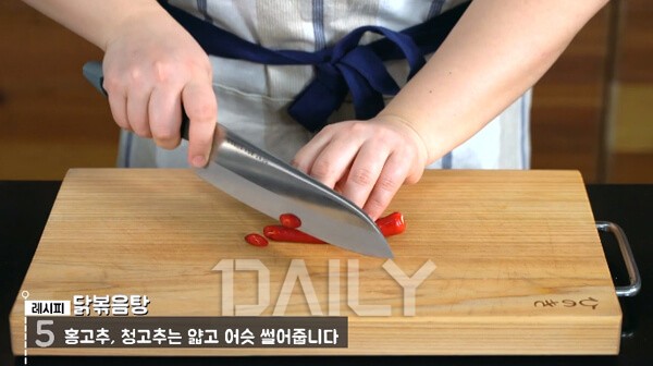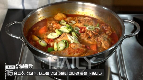 어슷하게 썰어 둔 고추와 대파를 넣고 5분 정도 지나 불을 꺼주면 요리는 끝이다. 닭고기로 요리를 할 때는 닭고기 특유의 비린내와 잡내가 항상 걱정인데, 물을 끓일 때 쌀뜨물을 사용하고 처음 끓일 때 냄비 뚜껑을 열어 두었기 때문에 잡내 걱정을 할 필요가 없다. 닭볶음탕 하나만으로도 훌륭한 반찬이 되어주기 때문에 따뜻한 밥 한 공기와 함께 식사를 즐기면 좋다.