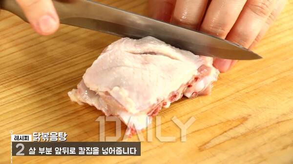 불순물을 깨끗이 씻어 준비한 닭고기에 붙어있는 살 부분에 앞뒤로 칼집을 넣어준다. 이렇게 고기의 앞뒤 부분에 칼집을 조금씩 넣어주면 양념을 넣었을 때 간이 살 안쪽까지 배어든다. 따라서 고기 속까지 간이 잘 밴 더 매콤하고 맛있는 닭볶음탕이 된다.