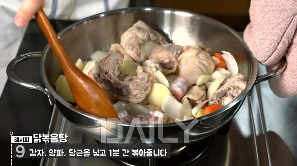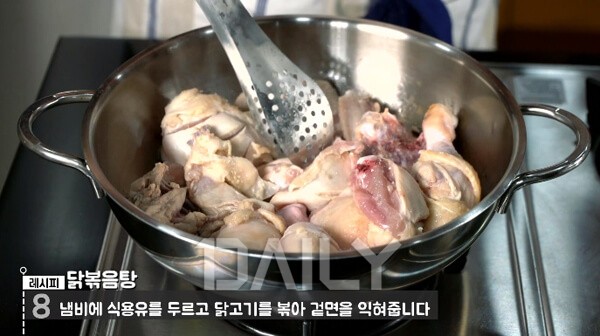 닭고기와 재료를 물에 넣고 끓이기 전에 겉면을 볶아주는 이유는 따로 있다. 이렇게 기름에 한번 볶아주면 양념에 고소한 풍미가 더해지기 때문이다. 생닭을 바로 물에 삶는 것보다 훨씬 감칠맛이 더해진다.