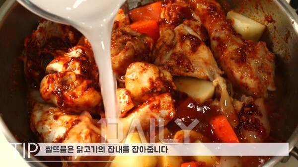 이후 양념장과 재료를 섞어주며 끓이다가 닭고기의 중간까지 물이 잠기도록 물을 부어준다. 이때 쌀뜨물을 부어주면 고기의 잡내를 잡아주어 더 담백하고 영양 있는 닭볶음탕을 만들 수 있다.