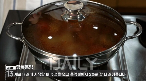 이후 재료가 끓기 시작하면 뚜껑을 닫는다. 한동안 재료가 끓으면 뚜껑을 덮고 중약불로 20분간 더 끓여주면서 푹 익힌다.