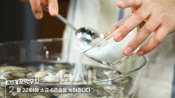 2-3. 물 2리터에 소금 6 큰 술을 녹이고 그늘진 곳에서 4시간 정도 해감 시킨다.