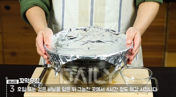 물 2리터에 소금 6 큰 술을 녹여서 해감을 준비한다. 그 뒤, 숨구멍을 조금 뚫어놓은 호일이나 검은 비닐을 덮어서 그늘진 곳에서 4시간 정도 해감 시킨다.