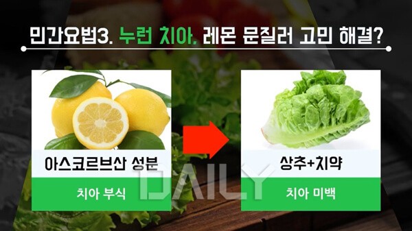 우선 레몬으로 치아를 문지르면 하얘지는 것은 사실이다. 그러나 이는 레몬의 아스코르브산 성분이 치아의 겉면을 부식시켜 일시적으로 하얘지는 것으로, 장기적으로는 치아를 약화시킨다. 치아 미백을 하고 싶다면 시중에 파는 미백 치약을 이용하거나, 이물질을 없애주는 성분인 상추를 갈아서 치약과 섞어 사용하면 좋다.