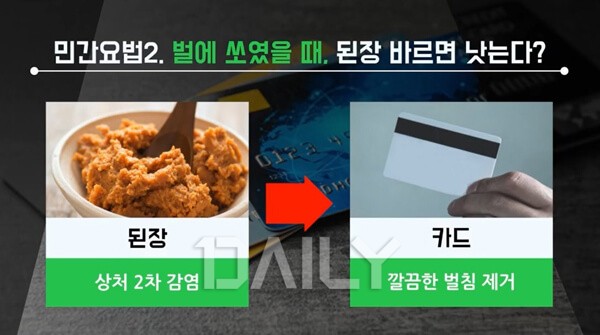 시골에서 벌에 쏘였을 때 가장 흔하게 쓰는 민간요법이 바로 '된장'을 바르는 것이다. 그러나 벌에 쏘여 상처가 난 곳에 된장을 바르면 세균, 미생물 등에 의한 2차 감염이 일어날 수 있어 상당히 위험하다. 벌에 쏘였을 경우 카드 등으로 벌침을 제거하고 상처 부위를 소독하고, 만약 상처가 심해지거나 알레르기 반응 등으로 부어오를 경우 병원을 찾아가야 한다.