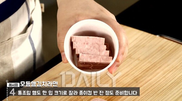 4. 통조림 햄은 한 입 크기 정도의 적당한 크기로 잘라준다. 통조림 햄도 다른 재료와 마찬가지로 종이컵 반 잔 정도의 양을 준비한다. 통조림 햄은 한 입 크기 정도로 썰어 준비한다.