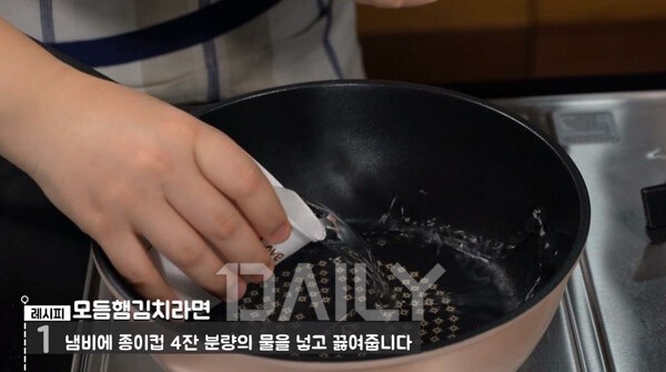 1. 냄비에 종이컵 4잔 분량의 물을 넣고 끓여준다. 가장 먼저 종이컵 4잔 분량의 물을 넣어준다. 일반 라면보다 다른 재료가 더 많이 들어가기 때문에 보통 라면을 끓일 때 보다 물을 더 넣어줄 필요가 있다.