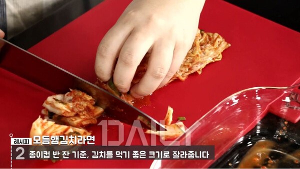2. 종이컵 반 잔 정도의 양의 김치를 적당한 크기로 잘라준다. 시간을 절약하기 위해 물이 끓는 동안 재료를 준비한다. 우선 김치는 종이컵 반 잔 정도 채울 수 있을 만큼 준비한다. 그리고 준비한 김치를 먹기 좋은 크기로 썬다.