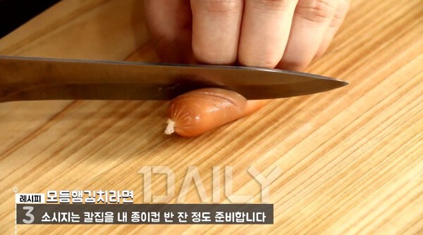 3. 소시지는 칼집을 내어 준비한다. 소시지에 약간의 칼집을 넣어준다. 소시지도 김치와 마찬가지로 종이컵 반 잔 분량으로 준비한다.