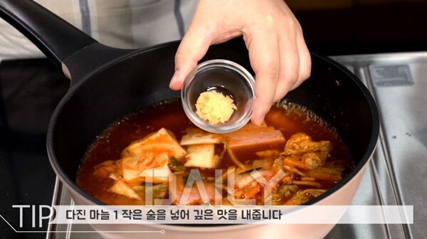 TIP : 모듬햄김치라면의 조금 더 깊은 맛을 위해 다진 마늘 1 작은 술을 넣는 것을 추천한다.