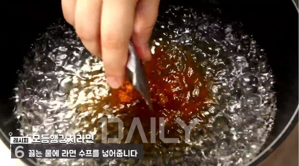 6-7. 물이 끓으면 가장 먼저 라면 수프를 넣은 뒤, 김치, 소시지, 통조림 햄을 넣는다. 물이 끓으면 가장 먼저 라면 수프를 넣어준다. 그다음, 대파를 제외한 김치, 소시지, 통조림 햄을 모두 넣어준다.