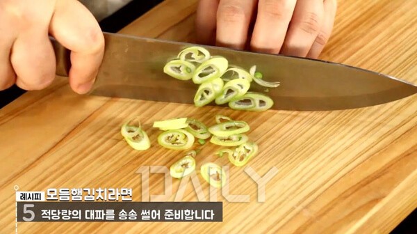 5. 대파를 송송 썰어 준비한다. 대파는 아삭아삭 씹히는 식감을 주고 더 깊은 맛을 내기 위해 필요하다. 적당한 양으로 대파를 송송 썬다.