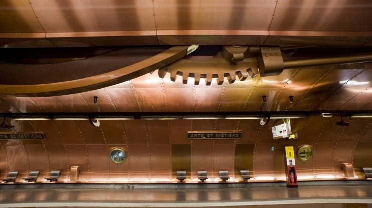 Arts Et Metiers역은 100년도 더 되어 오래된 느낌이 강한 프랑스 파리의 지하철역 중에서 흔치 않게 모던한 느낌을 주는 역이다. 거대한 우주선을 떠올리게 하는 이곳은 지하철 내부가 전체적으로 청동으로 둘러싸여 있다. 철로 위 천장을 보면 제조 공장의 분위기를 자아내는 톱니바퀴도 재현해 놓았다.