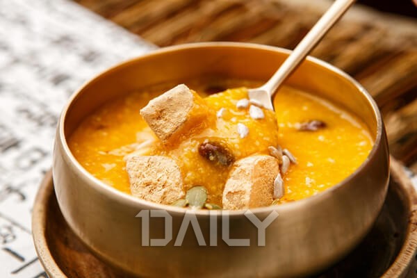 샛노란 색깔만 봐도 너무나 먹음직스러운데 왜 그 옛날에는 호박죽을 그렇게 싫어했을까? 아마 죽이라는 식감 자체가 싫었기 때문일 수도 있다. 혹은 부드럽게 입안을 감싸는 과하지 않은 달콤함이 어린 시절에는 이도 저도 아닌 밍밍한 단맛으로 느껴졌을 수도 있다. 찹쌀가루 대신 불린 찹쌀을 직접 갈아 넣으면 식감은 물론이고 풍미가 훨씬 다채로워지며 여기에 호박죽 색깔과 대비를 이루는 삶은 팥 고명까지 올리면 아침식사로도 손색없다.
