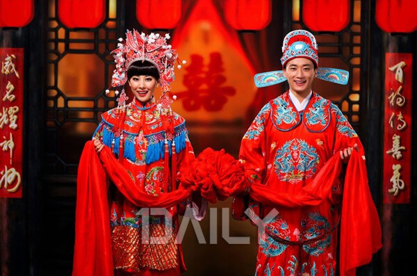 순백의 웨딩드레스는 금세 이혼한다는 미신이 있기 때문에 부와 번영의 상징인 붉은색의 전통 의상인 치파오를 입는다. 중국의 결혼식에는 주례와 주례사가 없이 결혼 증명서를 낭독하는 것으로 끝나는데 이후 피로연을 화려하고 성대하게 한다. 이때 피로연 테이블에는 코스요리와 함께 술, 담배, 사탕 세 가지가 무조건 올라온다. 사탕의 의미는 결혼식에 온 하객들에게 달콤함을 전해주기 위해서, 담배는 이날의 기쁨이 담배 연기처럼 퍼져 나가길 희망하는 의미라고 한다.