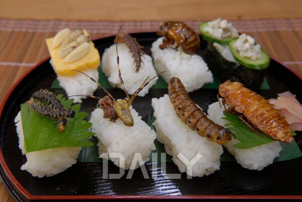 미래 식량을 대표할 먹거리로 곤충이 최적화라며 식용 곤충 사업이 확대되고 있는 요즘, 일본에서는 곤충을 이용한 김밥이나 초밥을 선보이고 있다. 특히 인기 있는 것은 매미 초밥인데 곤충 중에서도 생각보다 맛있으며 땅콩 맛이 감돈다고 한다. 매미 이외에도 사마귀나 애벌레, 하늘소 유충, 장수말벌 유충 등 그 종류만 해도 다양하다. 곤충을 주재료로 써서 만든 초밥이나 김밥을 먹어본 사람들의 반응은 처음 먹기가 힘들어서 그렇지 계속 먹다 보면 은은한 단맛과 담백한 맛이 좋다고 전했다.