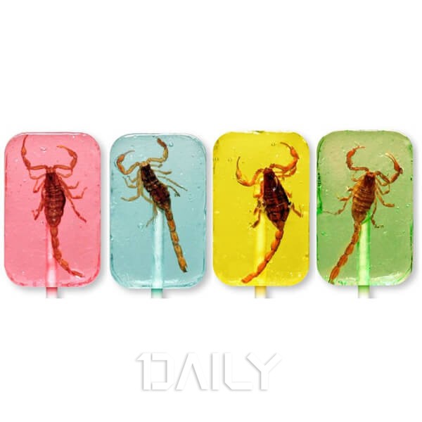 보통 전갈하면 위험한 곤충으로 생각되기 쉽다. 하지만 전갈 중에도 식용으로 사용할 수 있는 종류가 있다. 그런 종류를 이용해 만든 것이 바로 전갈 사탕이다. 미국의 유명한 HOTRIX에서는 이런 전갈을 이용해 사탕을 만들었다. 빨강, 초록, 노란색 등 알록달록한 사탕의 색을 띠고 있는데 그 안에 전갈이 다소곳하게 자리 잡고 있다. 예상외로 반응이 좋아지자 회사에서는 전갈에 이어 애벌레와 지네, 귀뚜라미 등을 넣은 곤충 사탕을 판매하고 있다.