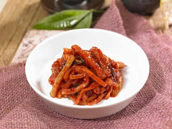 오독오독 씹는 식감이 매력적인 무말랭이. 깨끗이 씻어 손질한 무는 6cm 길이, 1cm 두께로 썰어준다. 무를 겹치지 않게 펼치고, 햇볕이 잘 드는 곳에 3일 동안 말려준다. 말린 무는 물에 2~3번 씻어 반쯤 말랑해지면 사용한다. 시중에 판매하는 무말랭이를 사용할 경우, 따뜻한 물에 담가 불린 후, 2~3번 정도 주물러 씻어준다. 무말랭이가 반쯤 말랑해지면 물기를 꽉 짜준다. 양념 재료는 간장 2큰술, 설탕 1큰술, 맛술 1큰술, 참기름 1큰술, 다진 마늘 1/2큰술, 고춧가루 4큰술, 통깨 약간 넣어 골고루 섞어준다. 무말랭이에 준비한 양념을 넣고 조물조물 무쳐 완성한다.