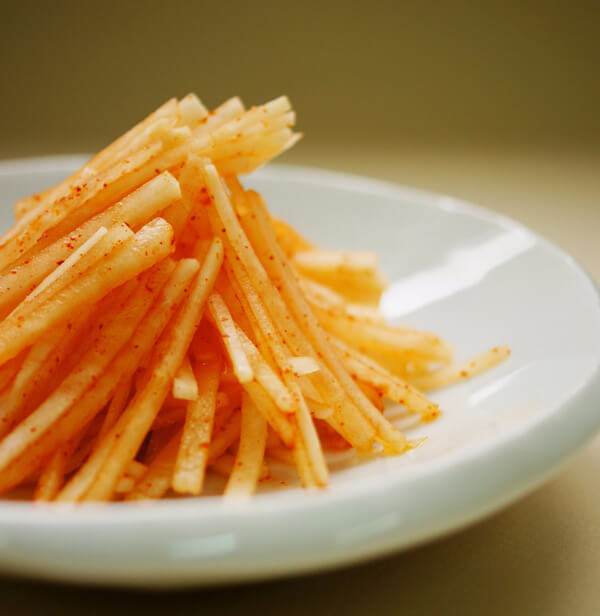 간단하고 빠르게 만들 수 있는 기본 밑반찬 ‘무생채’. 먼저 무는 폭과 두께, 길이를 일정하게 채를 썰어준다. 채 썬 무에 고춧가루 물을 들인다. 볼에 준비한 무채를 넣고 고춧가루 1/2큰술, 식초 1작은술, 설탕 1작은술, 소금 1/2작은술, 다진 파, 다진 마늘, 다진 생강, 깨소금 조금을 넣어 살짝 버무린다. 하나의 팁으로, 무채를 결 방향으로 썰어주면 무채의 아삭한 식감을 더욱 살릴 수 있다.