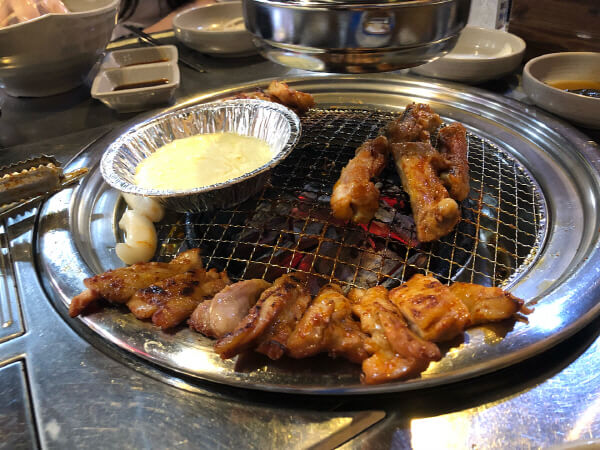 철판에 볶아 먹는 닭갈비는 흔히 볼 수 있지만 숯불에 구워 먹는 닭갈비는 의외로 찾기가 쉽지 않다. 깡통 닭갈비의 닭갈비는 야들야들한 닭고기에 양념이 잘 배어있고 숯불로 굽다 보니 불 향이 깃들어 계속 생각나는 맛으로 유명하다. 데리야끼와 순한 맛 매운맛을 선택할 수 있는 세트 메뉴를 시키면 혼합해서도 가능하고 여기에 막국수나 묵사발이 함께 제공된다. 양념이 된 고기라 자칫 잘못하면 불판에 눌어붙을 수 있기 때문에 직원이 직접 다 구워주고 잘라주며 불판 역시 일회용을 사용하기 때문에 훨씬 위생적으로 먹을 수 있다.