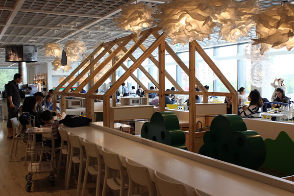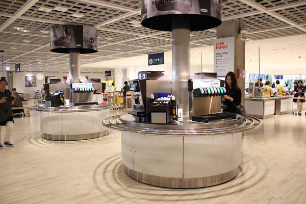 트렌디한 인테리어를 선보이는 이케아는 푸드코트 역시 다양한 인테리어와 좌석을 선보이기 때문에 취향에 따라 원하는 자리에 앉아서 즐기면 된다. 5~6명이서 함께 식사하기 좋은 둥근 테이블, 간단히 음료를 즐기며 휴식하기 좋은 소파 좌석 그리고 놀이방이 붙어있는 테이블. 놀이방 주위를 바 테이블로 연출해 편히 식사하면서 아이들을 볼 수 있기 때문에 특히 아이와 함께 온 부모들에게 더할 나위 없이 편리한 좌석이다.