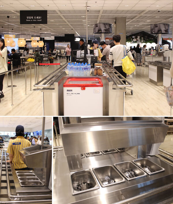 이케아 푸드코트 이용 시 필요한 카트를 끌고 음식을 담을 트레이를 꽂아 원하는 음식을 담아 마지막에 계산하는 시스템으로 이루어져 있다. 카트가 준비되면 먼저 음료부터 선택할 수 있는데, 트레이 옆에 비치된 유리컵과 머그컵 중에 하나를 선택하면 된다. 음료는 1,000원 커피는 1,500원으로 푸드코트 중앙에 있는 셀프바에서 콜라, 사이다, 커피 등 다양한 음료를 무한으로 즐길 수 있다.
