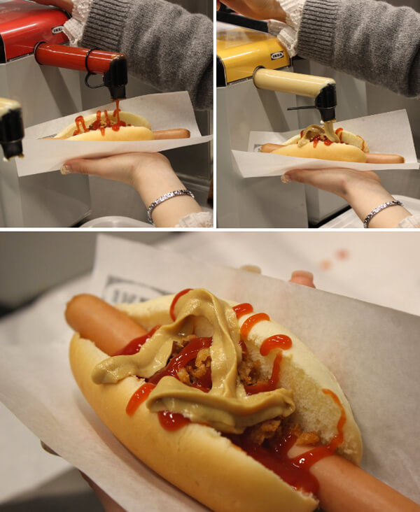 핫도그를 주문하면 계산대 옆에서 소시지를 샌드한 빵 위에 양파 튀김을 올려서 제공한다. 소스는 옆에 마련된 셀프바에서 케첩과 머스터드소스를 자유롭게 뿌려 먹을 수 있고, 음료 역시 무한으로 즐길 수 있다. 별다른 토핑이 없는 심플한 핫도그지만 자꾸만 생각나는 중독성이 있다. 이케아 핫도그의 구성 재료인 빵, 소시지, 양파튀김, 소스는 모두 스웨덴 푸드 마켓에서 구매하니 재료를 다 사 와서 집에서도 쉽게 만들어 먹을 수 있다.