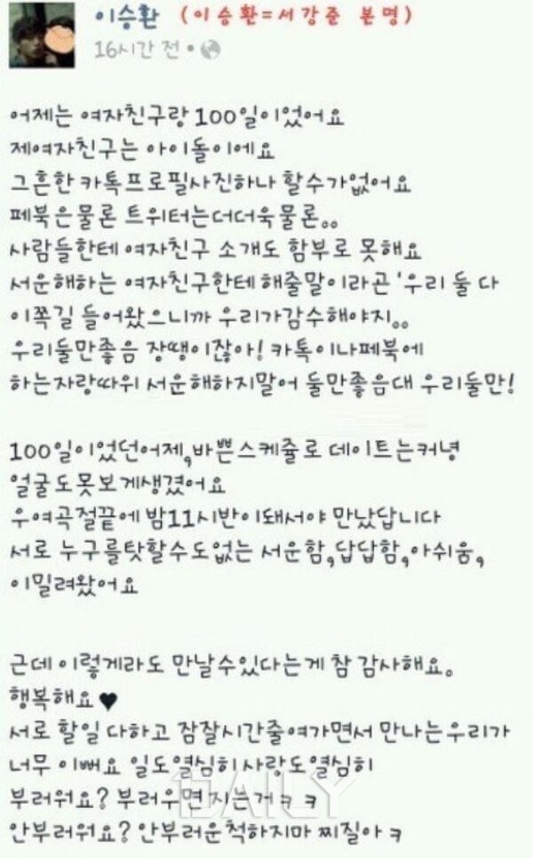 서강준은 자신의 SNS에 “어제는 여자친구랑 100일이었어요. 제 여자친구는 아이돌에요. 그 흔한 카톡 프로필 사진 하나 할 수가 없어요. 페북은 물론 트위터는 더더욱 물론”이라는 글을 작성했다. 특히 마지막에는 “부러워요? 부러우면 지는 거. 안 부러워요? 안 부러운 척 하지 마. 찌질아”라고 덧붙여 흑역사를 생성했다.