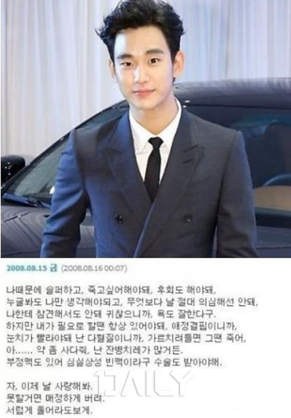 김수현은 싸이월드에 흑역사를 남겼다. 김수현은 지난 2008년 “나 때문에 슬퍼하고, 죽고 싶어 해야 돼. 후회도 해야 돼”라며 “약 좀 사다 줘. 난 잔병치레가 많거든. 부정맥이 있어 심실상성 빈맥이라고 수술도 받아야 해”라고 말했다. 이어 “자, 이제 날 사랑해봐. 못할 거면 매정하게 버려. 서럽게 울어라도 보게”라는 글을 작성했다.