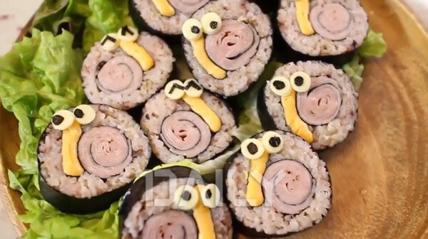 귀여움 팡팡 터지는 달팽이 김밥을 만들어보자. 김을 반으로 자르고 그 위에 2등분 한 슬라이스 치즈를 길게 깔아준 다음 말아준다. 그다음에는 김 한 장에 슬라이스 햄을 길게 깔고 돌돌 말아준다. 이 두 개만 잘 준비해준다면 달팽이 김밥이 거의 완성된 셈. 김 위에 2/3 정도 밥을 얇게 깔아주고 미리 말아 놓은 치즈와 햄을 올린 다음 고 그 위에도 밥을 살짝 덮어준다. 잘라준 다음 하얀색 치즈와 검은깨를 이용해 눈까지 만들어 붙여주면 아기자기한 달팽이 김밥이 완성된다.