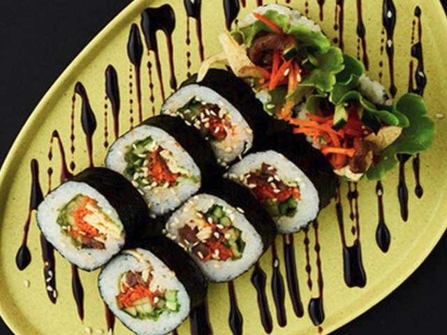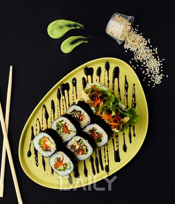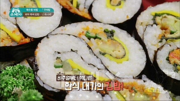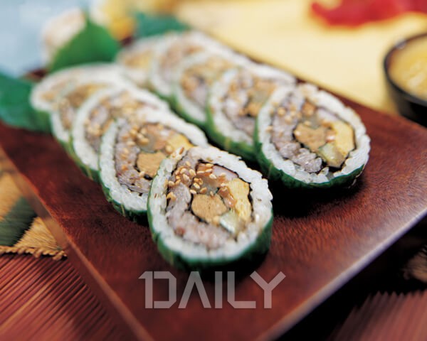 왠지 상큼할 것 같지만 실제로는 고소한 맛이 일품인 사과 김밥도 인기 메뉴다. 계란 지단을 먼저 만드는데 채 익기 전에 맛살 흰색 부분이 서로 겹쳐지게끔 위에 올려 돌돌 말아준다. 소금과 참기름, 깨, 식초, 설탕 등의 양념을 넣어 밥에 간을 한 다음 김 위에 넓게 펼쳐주고 만들어 놓은 맛살 지단을 올려준다. 모양을 잘 잡아주어 돌돌 말아준 다음 썰면 앙증맞은 사과 김밥이 완성된다. 사과 과육 부위에 검은깨 2개를 콕콕 올려주면 사과씨와 같은 디테일을 연출할 수 있다.