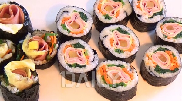 엄마의 마음을 하트 김밥으로 표현해보는 것은 어떨까? 스팸만 있으면 간단한 핑크 하트 김밥을 만들 수 있다. 스팸을 도톰하게 썰어 앞뒤로 노릇하게 구워준 다음 식혀서 45도 각도로 비스듬하게 잘라준다. 그리고 두 개를 겹쳐서 하트 모양으로 만든 다음 반으로 자른 김으로 돌돌 말아 감싸준다. 김으로 감싼 하트의 움푹 들어간 부분에 밥을 채워 준비해둔다. 자르고 남은 김 위에 밥을 골고루 올리고 하트 모양을 올린 다음 그대로 말아 썰어주기만 하면 완성이다. 스팸의 짭조름함이 있으니 밥에는 식초와 설탕으로 양념해주면 더욱 맛깔스러운 김밥이 된다.