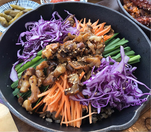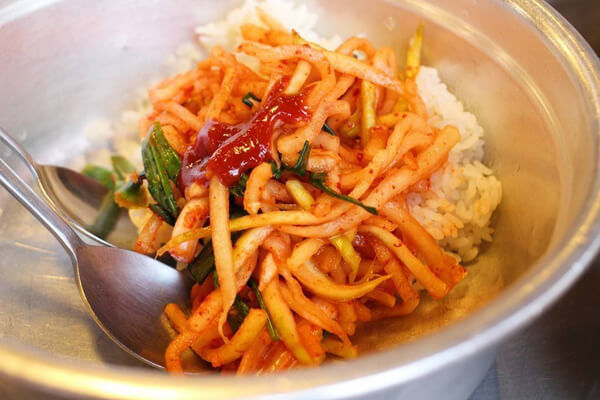 무채 비빔밥은 단순하게 쌀밥 위에 무채와 참기름, 고추장을 담아서 제공한다. 특별한 맛은 아니지만 무채의 아삭한 식감과 시원하고 개운한 맛이 자칫 느끼할 수 있는 고기의 느끼함을 잡아준다. 즉석에서 무쳐주는 파무침 역시 은근 별미. 비교적 저렴한 가격으로 주머니 걱정 없이 즐길 수 있다.