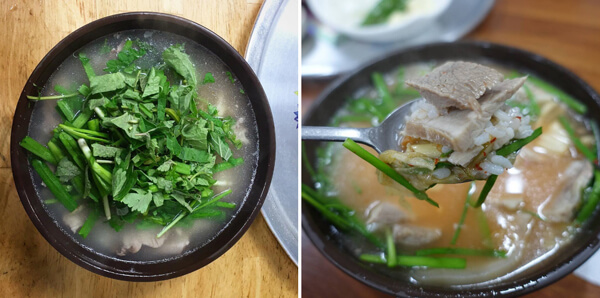 토렴 방식으로 밥이 말아져 나오는데, 밥알에 국물이 잘 배어들어 진한 맛을 낸다. 국밥에 김치가 들어있어 김치 국밥을 먹는 듯한 느낌도 든다. 이 집의 또 다른 묘미는 방아잎. 돼지국밥 위에 부추와 방아잎을 가득 넣어주는데, 이 방아잎이 돼지 잡냄새는 잡아주고 얼큰한 국물 맛을 살려 밀양 돼지국밥의 제맛을 느낄 수 있다. 방아잎만큼이나 푸짐하게 들어있는 내장과 머리 고기 때문에 한 그릇만 먹어도 속이 든든하다.